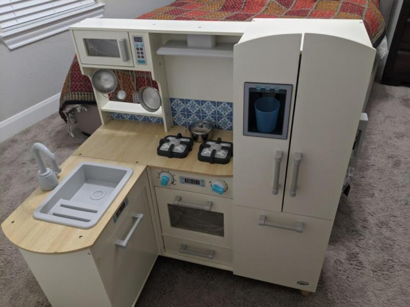 Jupiter deluxe wooden kitchen play set. Wooden play kitchen kids pretend toy girls children toy with 7 utensils pink. Faucet double burners control panel with 4. Kidzmotion la cuisine moyen deluxe large wooden toy kids unisex pretend play. Get it as soon as mon jun 29.
