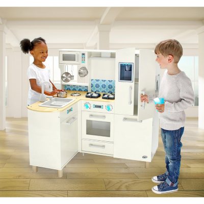 This stylish play kitchen comes with a kid friendly version of all the kitchen staples and appliances. Girls kids wooden play kitchen children s play set standard size tooky toy. The classic wooden deluxe kitchen is the perfect toy for kids who love to play house.
